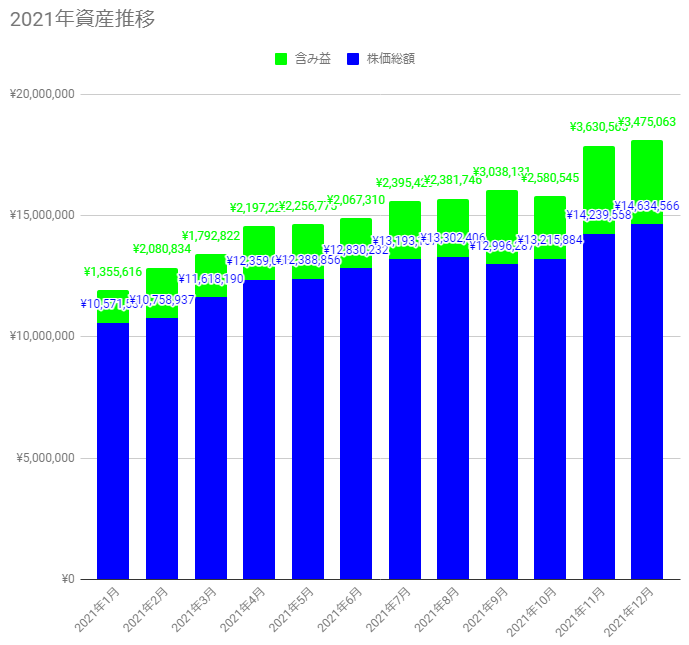 とはいえ一応、年間を通してみると年初の1月時点では135万円ほどだった含み益は、12月で347万円と157%の上昇という自分でいうのもなんですが驚異的な数字でした。