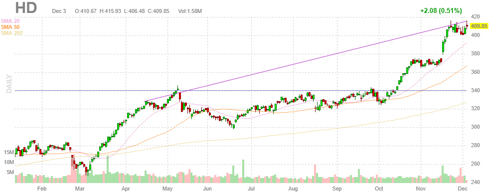 決算後の勢いが止まらないホームデポの11月パフォーマンスは、+28.87ドルでした。
