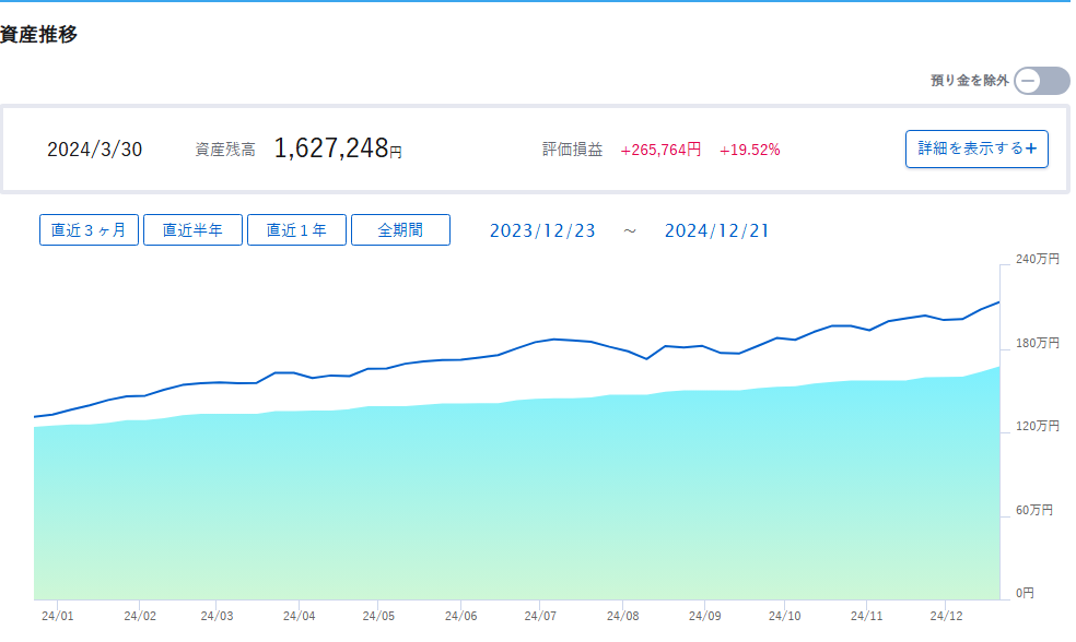 ちょうど1年前においては、220万円くらいの資産だったので入金の原資に加えおよそ80万円くらい資産として純増した形となります。