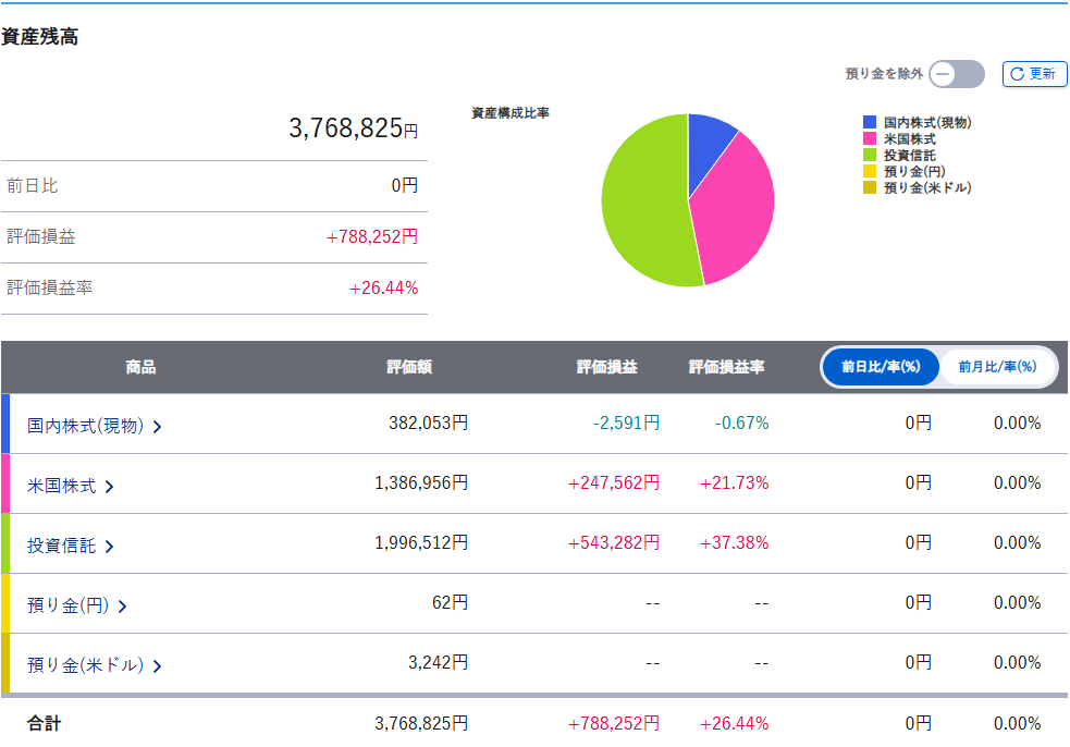 詳細となる損益の内訳としては、米国株が+215,566円(24.80%)で、投資信託が+493,499円(33.95%)という結果でした。